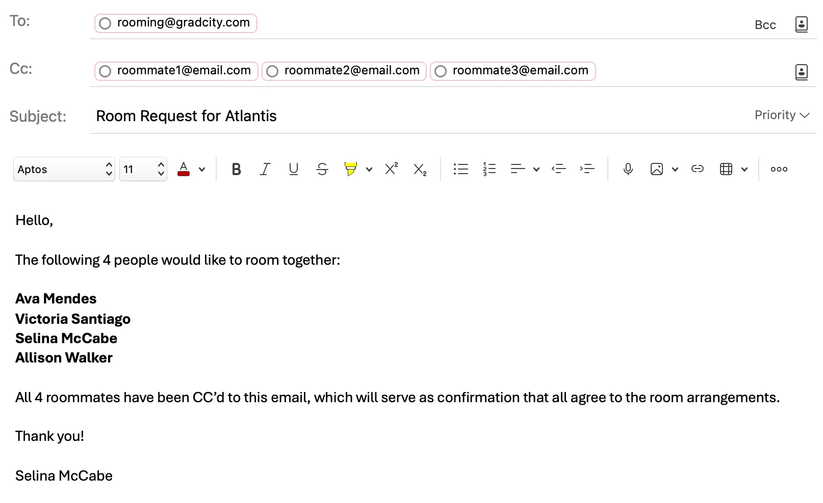 Consent Required: All roommates must agree to their rooming arrangements. The rooming submission process, listed below, will explain this in further detail. We do not assign roommates at random.
