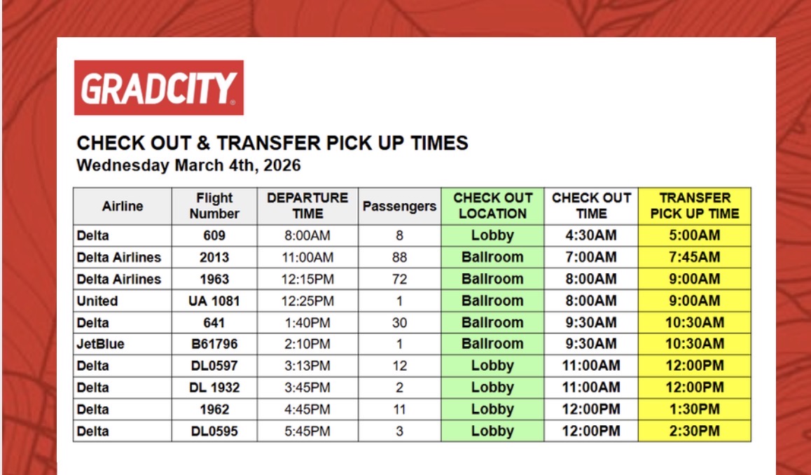 Times will be sent out via text/email by the GradCity. You can also check with a team members for your pick up time. Please verify your transfer/pick-up time.